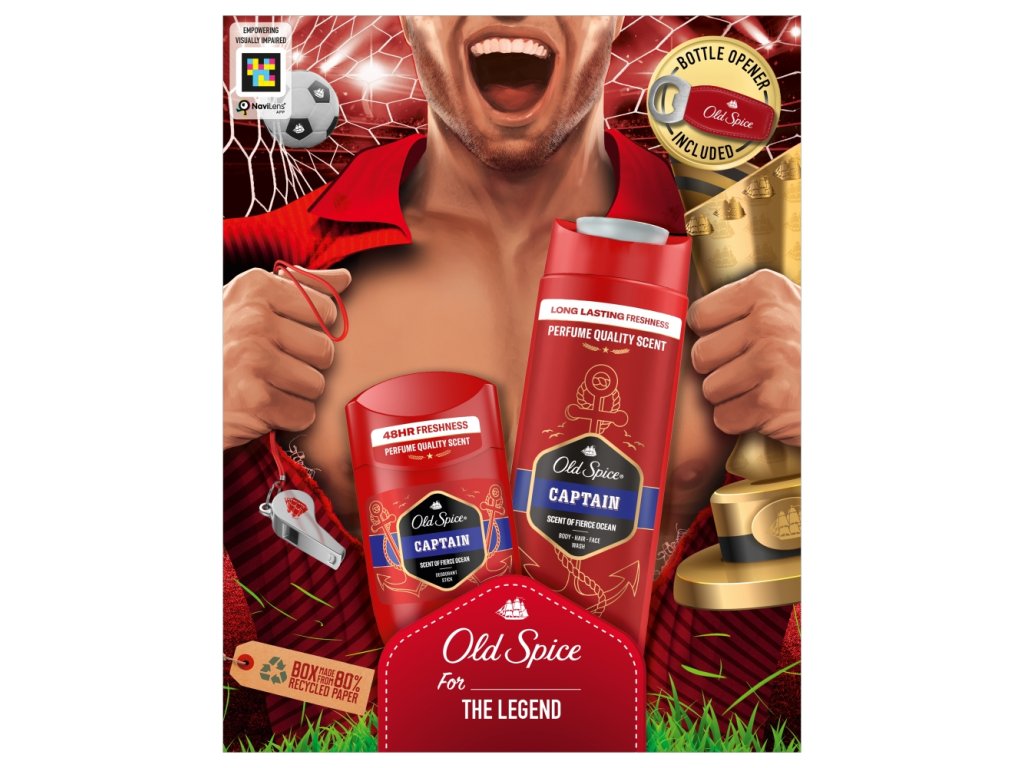 Il set regalo comprende un deodorante solido da 50 ml e un gel doccia Captain da 250 ml, oltre a un apribottiglie Old Spice .