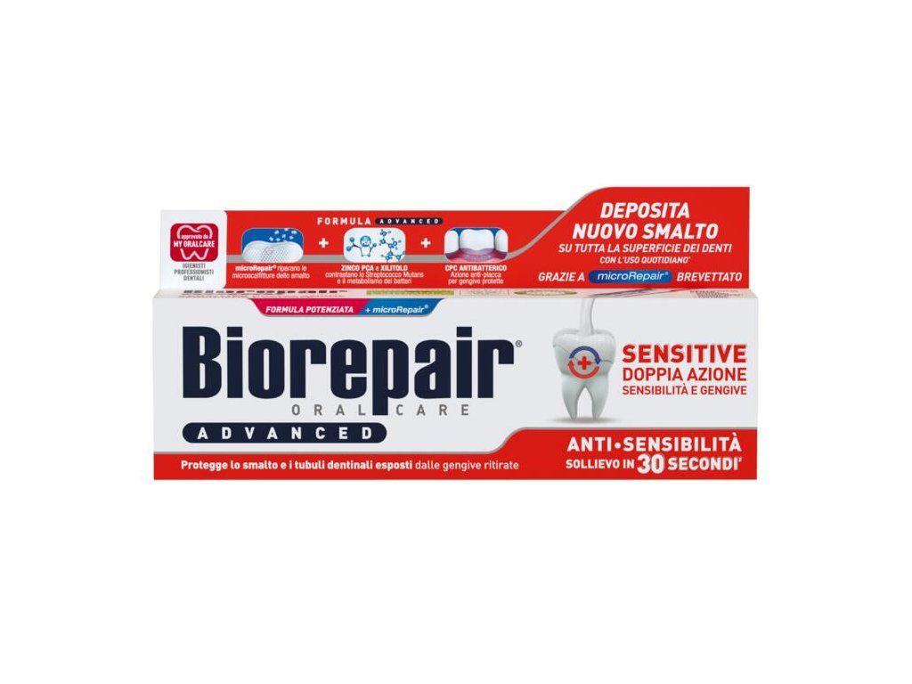 Sollievo e protezione immediati per denti sensibili - Allevia la sensibilità dentale in 30 secondi. - Protegge lo smalto dall'erosione acida e dall'aggressione batterica. - Previene la formazione di placca e carie. - Contiene microparticelle microRepair® che ripristinano e rinforzano lo smalto dei denti, creano una barriera protettiva e proteggono i tubuli dentinali esposti. Modo d'uso: Versare il dentifricio sulle setole dello spazzolino, spazzolare i denti accuratamente e delicatamente, sciacquare la bocca al termine dello spazzolamento e sputare i residui, non ingerire. Lavarsi i denti due volte al giorno.Parametri aggiuntivi