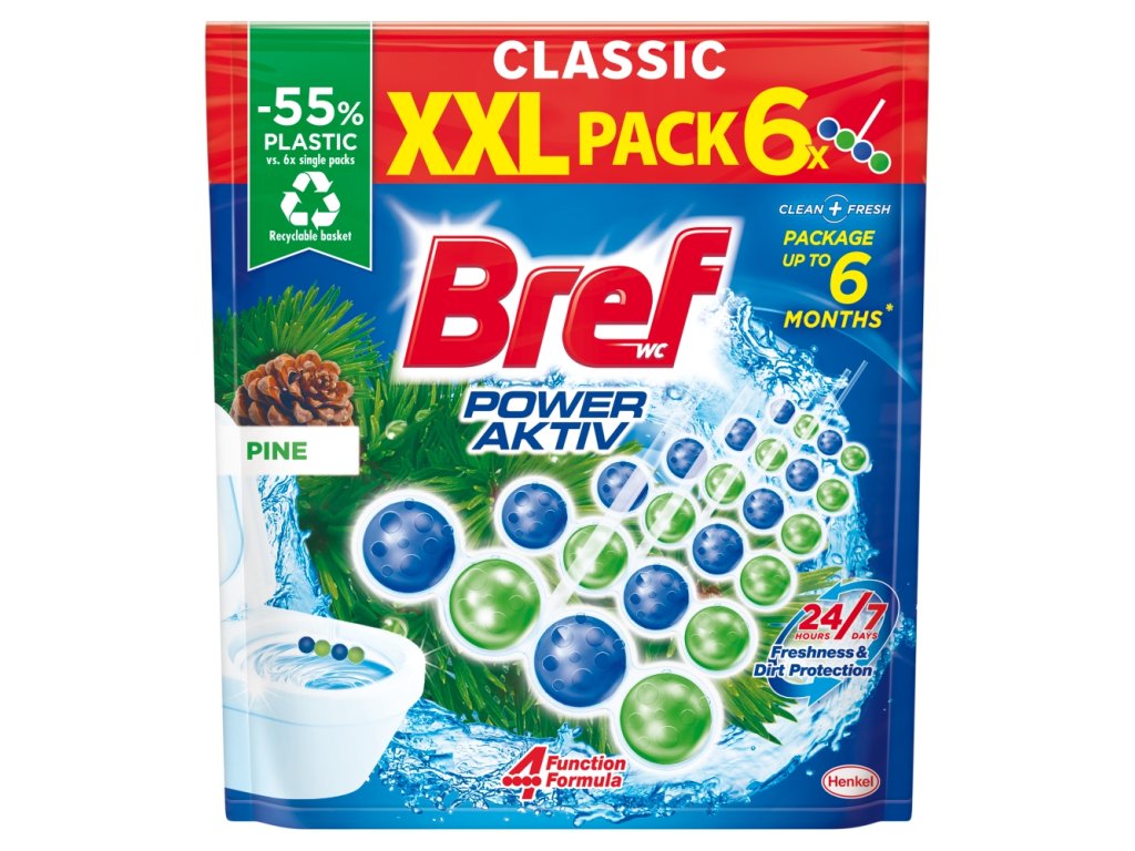 La tavoletta WC Bref Power Aktiv al profumo di pino manterrà il vostro WC igienicamente pulito ad ogni scarico e lo renderà speciale grazie al suo design accattivante. L'elegante confezione a forma di quattro sfere offre quattro funzioni che garantiscono la perfetta cura del WC: pulizia igienica, schiuma detergente, protezione dal calcare e freschezza a lunga durata.