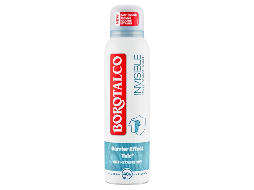 Il deodorante Borotalco Invisible è stato appositamente sviluppato per ridurre la comparsa di macchie gialle sui tessuti chiari e di macchie bianche sui tessuti scuri. Grazie alla sua composizione con Microtalco che assorbe il sudore , il deodorante regola la sudorazione e garantisce una pelle asciutta ogni giorno. Formula antimacchia. Deodorante unisex . Effetto DEO affidabile per 48 ore. 0% alcol . Dermatologicamente testato.