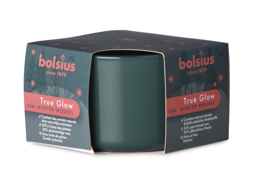 Candela profumata Bolsius True Glow in vetro, 90x63mm, Winterwoods