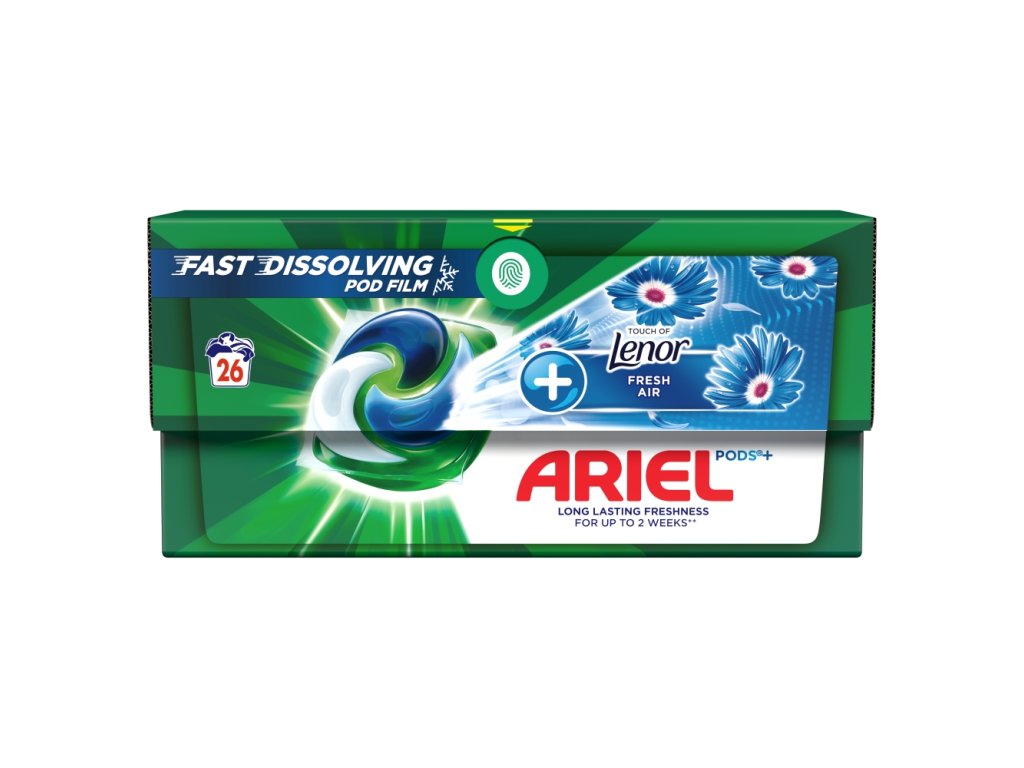 Capsule di gel Ariel Touch of Lenor Fresh Air confezione da 26 pezzi.