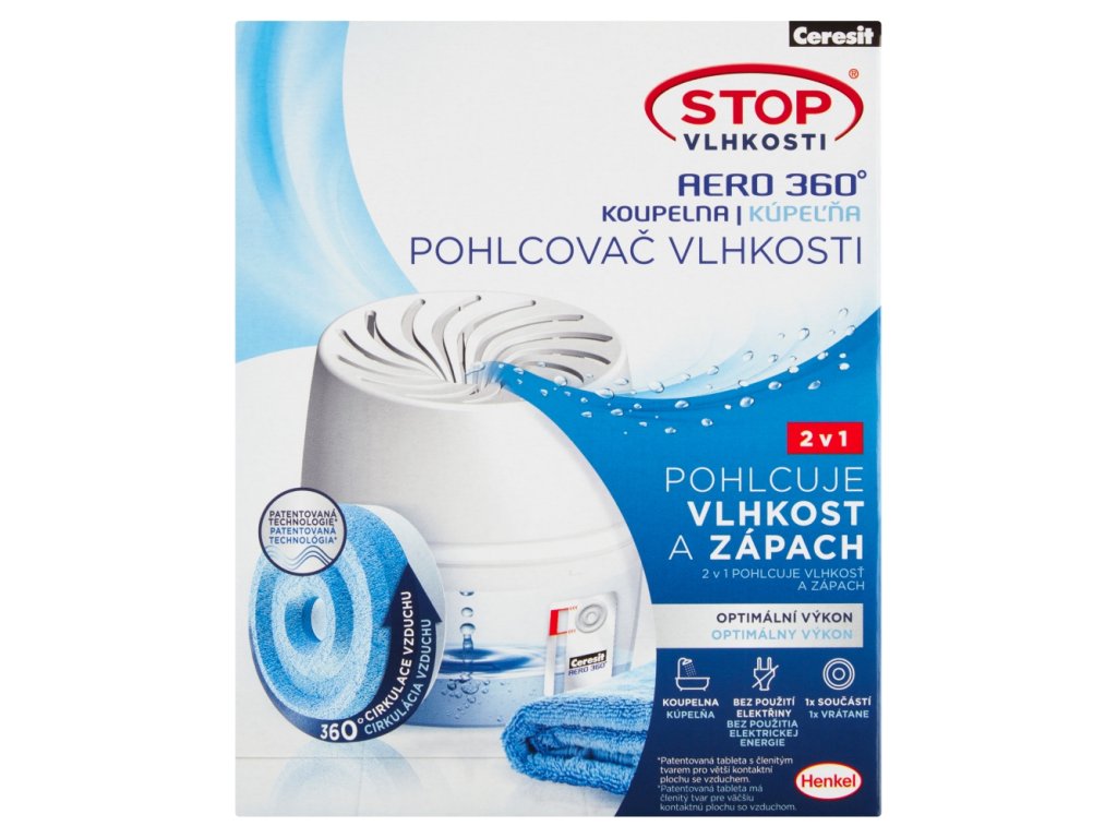 L'assorbitore di umidità Ceresit Stop Aero 360° aiuta a ottimizzare l'umidità in eccesso e a neutralizzare gli odori attraverso il flusso d'aria. Il dispositivo ha una forma aerodinamica e un esclusivo foro di ventilazione attraverso il quale l'aria fluisce verso la compressa. È progettato principalmente per l'uso in bagni fino a 10 m². È proprio in bagno, dove le possibilità di ventilazione sono spesso limitate, che la lotta contro l'umidità indesiderata risulta spesso vana, con conseguenti muffe, asciugamani ammuffiti e aria sgradevole.