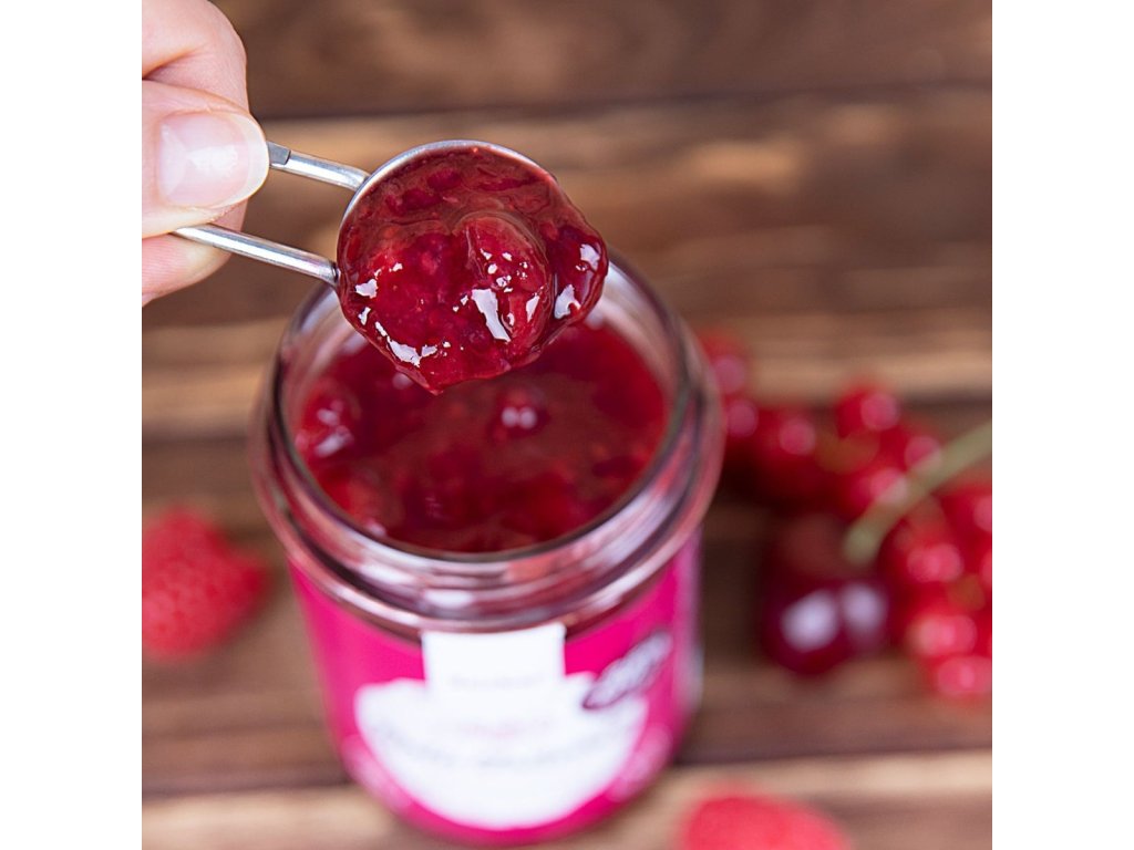 La confettura di frutti rossi unisce i sapori di fragole, ciliegie, lamponi e ribes ed è anche povera di zucchero.