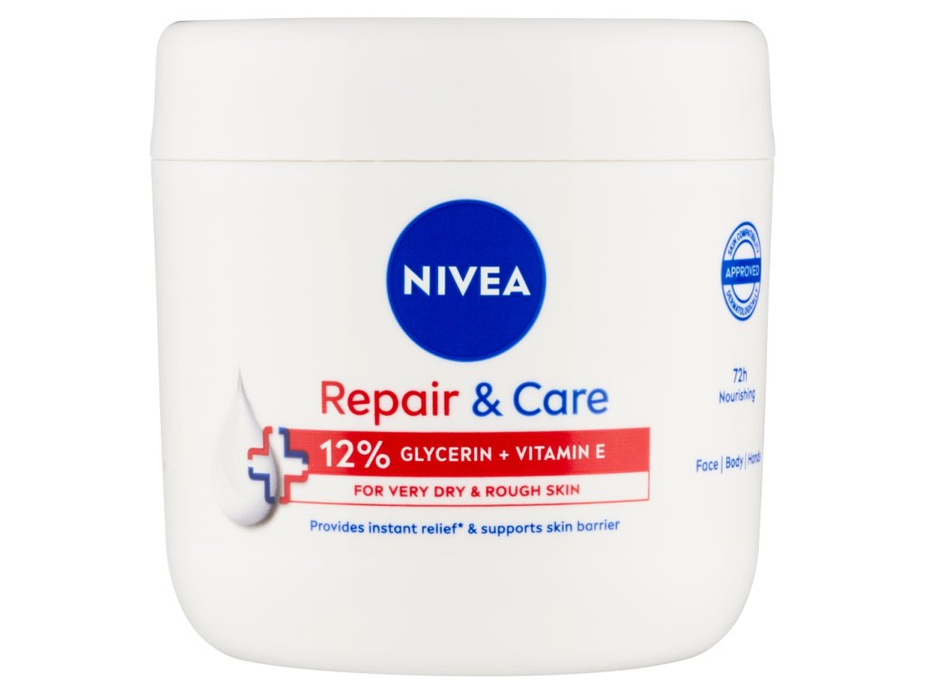 Crema corpo Nivea 400 ml Repair & Care per pelle secca è una crema multifunzionale, idrata in profondità e ammorbidisce la pelle secca e ruvida. La composizione contiene il 12% di glicerina e vitamina E. Trattamento rigenerante e extra idratante per la pelle di tutto il corpo. Non altera la naturale barriera cutanea. Adatta all'uso quotidiano. Dermatologicamente testata.
