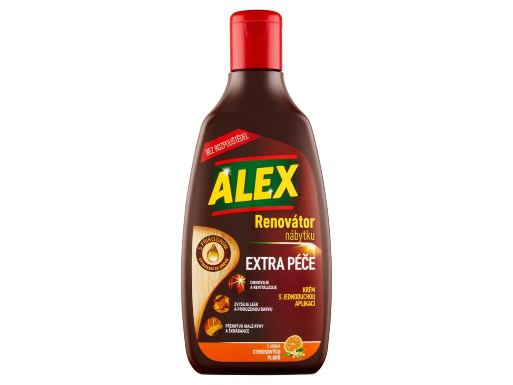 Alex extra care - crema di facile applicazione. La nuova crema con estratto naturale di legno offre la massima cura per il restauro e la protezione dei mobili, facendoli tornare come nuovi. Alex extra care è la soluzione migliore per il restauro dei mobili, anche i più delicati. La sua formula esclusiva permette di rinnovare e rivitalizzare i mobili, aumentarne la lucentezza e ravvivarne il colore naturale. Inoltre, copre piccoli graffi e ammaccature. È priva di solventi e delicata sulle superfici.