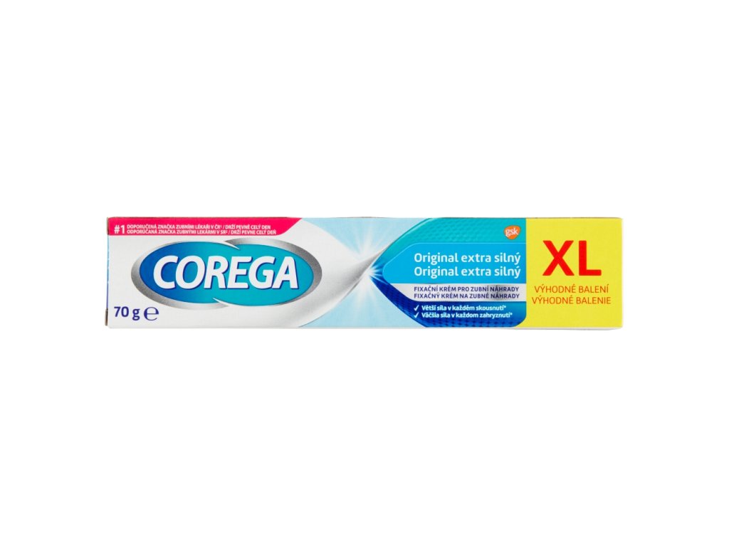 La crema fissante COREGA® Extra Strong garantisce un fissaggio affidabile delle protesi per tutto il giorno. Anche se le protesi si adattano perfettamente, la crema Corega le sigilla, impedendo a sgradevoli residui di cibo di depositarsi sotto di esse. Non contiene coloranti o aromi artificiali che potrebbero alterare il sapore degli alimenti. La pratica forma del collo del tubetto consente un dosaggio e un'applicazione più precisi della crema.