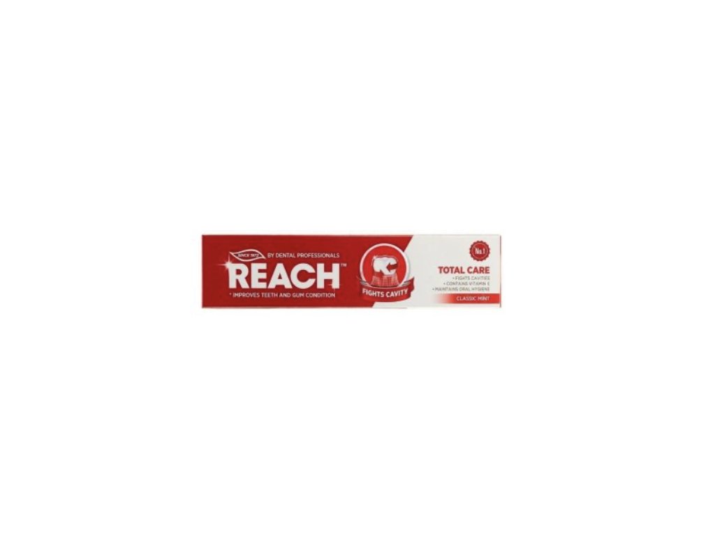 Reach Total Care Classic Mint è un dentifricio completo che offre sei benefici chiave per la salute orale. È progettato per rimuovere efficacemente la placca, rinforzare lo smalto dei denti, proteggere dalle carie e rinfrescare l'alito.