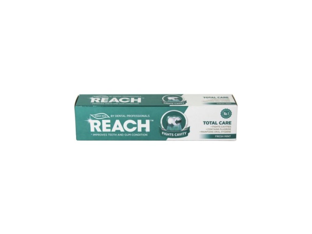 Reach Total Care Fresh Mint è un dentifricio completo per la cura quotidiana di denti e gengive. È studiato per rimuovere efficacemente la placca, proteggere dalla carie e rinforzare lo smalto.