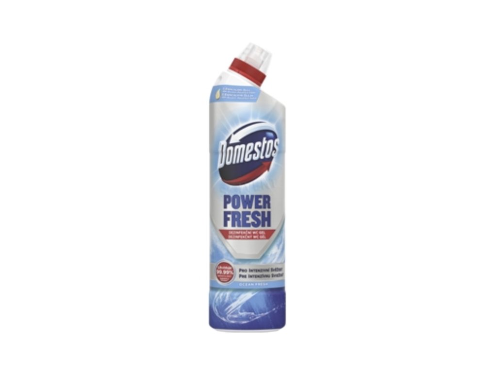 Domestos Power Fresh è un gel disinfettante studiato per rimuovere il calcare dal WC. Aderisce alla superficie del water, dove agisce a lungo, anche sotto la superficie dell'acqua .