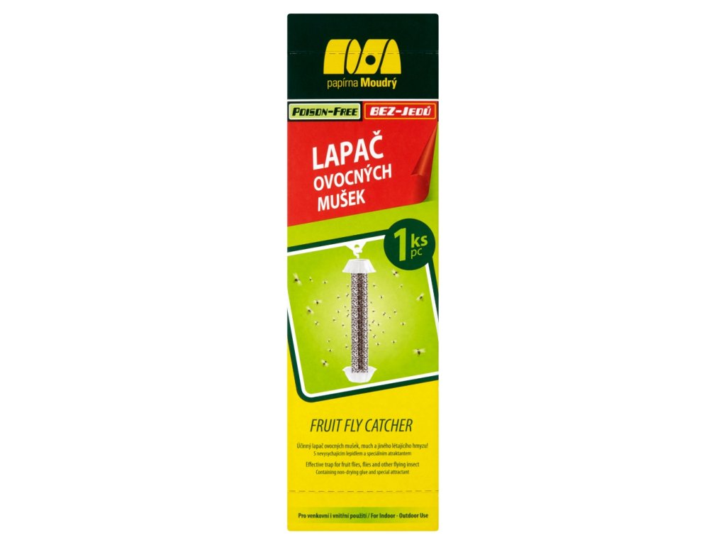 La trappola sospesa è progettata principalmente per catturare moscerini della frutta (Drosophila), mosche domestiche (Musca domestica) e altri insetti volanti difficili da catturare. Questa trappola per mosche è sicura, efficace e molto facile da usare. Rappresenta un'alternativa adatta alle classiche trappole per mosche per uso domestico, cucine professionali o impianti di produzione. L'attrazione è garantita da uno speciale attrattivo in combinazione con la superficie lucida della superficie adesiva. La colla è stata creata in collaborazione con il dipartimento di ricerca dell'Accademia Slovacca delle Scienze. È stata sviluppata una colla resistente alle alte temperature e ai raggi UV, con lunga durata e massima adesività immediata: è sufficiente un contatto minimo con la colla e l'insetto è attaccato. Non è necessaria alcuna esca aggiuntiva sulla trappola.