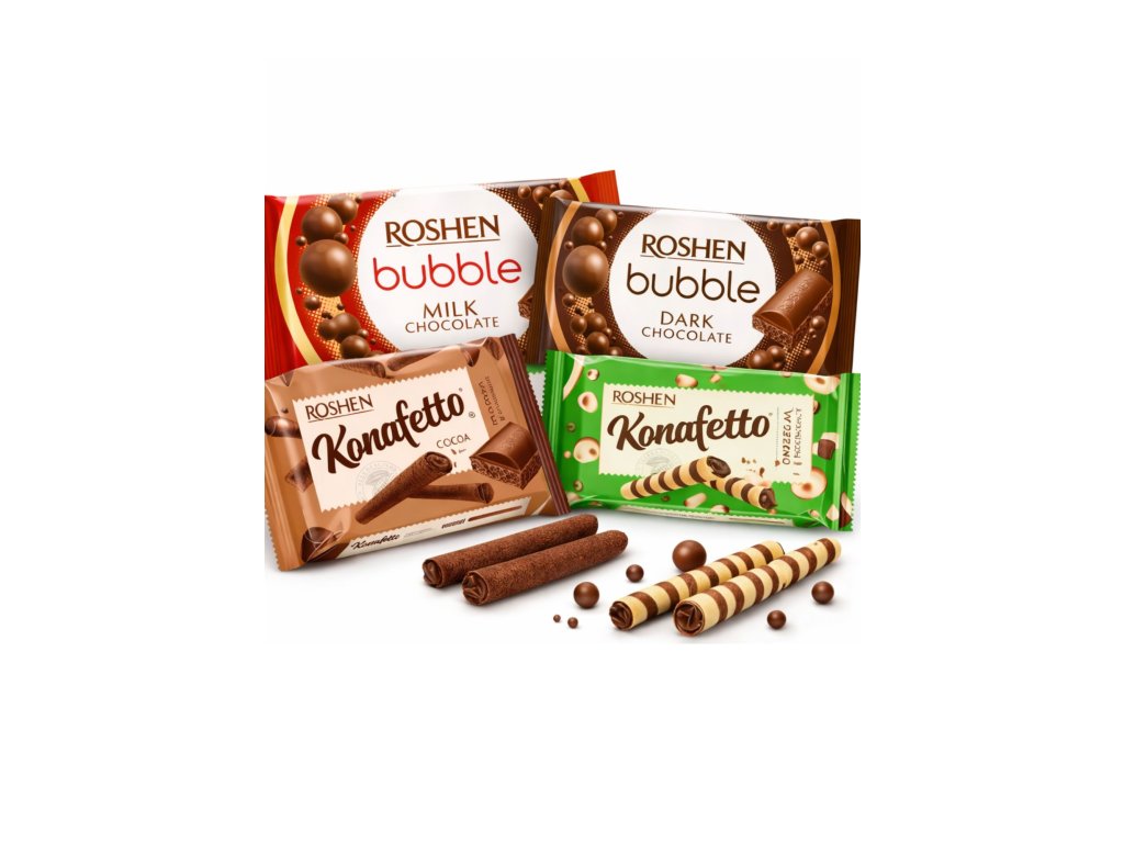I Roshen Konafetto sono croccanti wafer ripieni di un delicato ripieno di nocciole , che combinano un leggero impasto per waffle con una deliziosa crema al gusto di nocciole. Grazie alla fragile struttura del wafer e al delicato ripieno, offrono un equilibrato mix di croccantezza e dolcezza.
