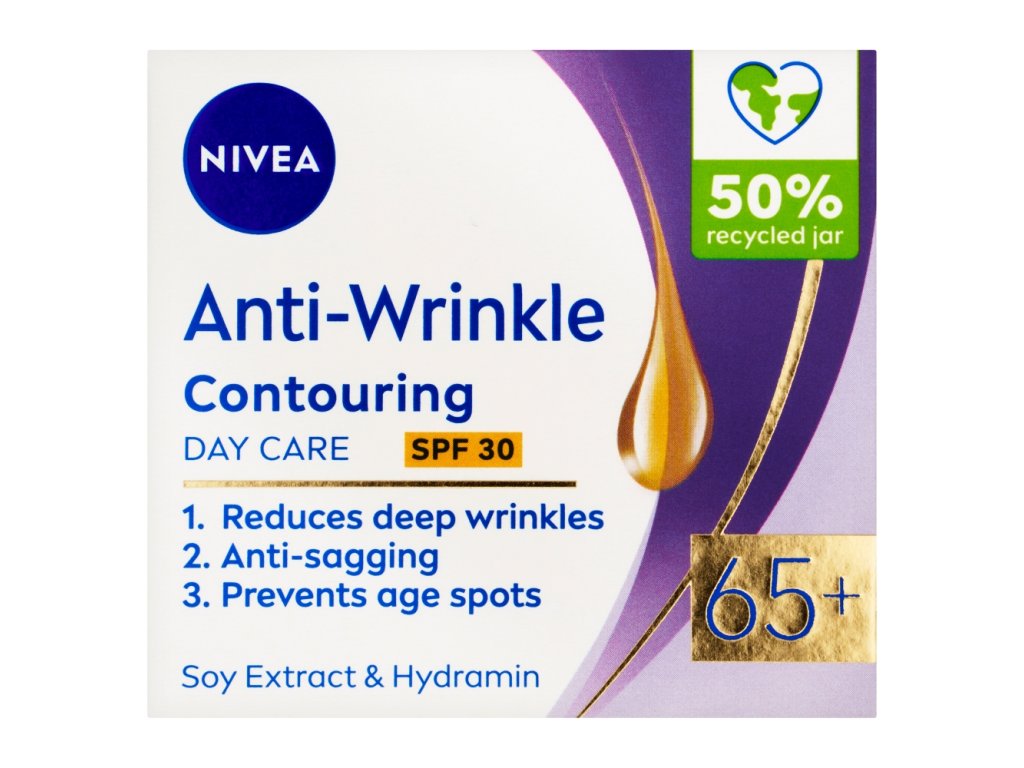 Di' addio a rughe e rilassamento cutaneo. La ricca crema con elevata protezione UV previene efficacemente la comparsa di macchie senili e riduce visibilmente anche le rughe più profonde. La formula idratante con estratti di soia migliora i contorni del viso e le dona la spinta necessaria. Fai risplendere di nuovo la tua pelle, affidati a: NIVEA Contour Improving Day Cream 65+ con SPF 30 .