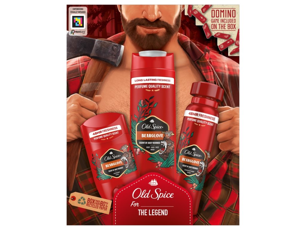 Il set regalo Old Spice Bearglove comprende un deodorante, un deodorante solido e un gel doccia dal profumo fruttato, confezionati in una scatola con il design del boscaiolo.