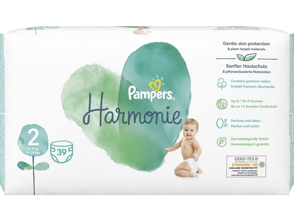 Protezione delicata della pelle. Con ingredienti di origine vegetale. I pannolini Pampers Harmonie sono realizzati in cotone di prima qualità, morbide fibre vegetali e altri materiali accuratamente selezionati, sono dermatologicamente testati e delicati sulla pelle del tuo bambino. Sono senza profumo, senza lozione e senza nessuna delle 26 sostanze classificate come allergeni dalla direttiva UE, e garantiscono fino a 12 ore di asciutto Pampers, per una garanzia di qualità su cui i genitori possono contare. Sono dotati di un pratico indicatore di umidità Pampers e hanno una simpatica stampa: tu e il tuo bambino li adorerete. I pannolini Pampers Harmonie sono realizzati in cellulosa ottenuta da fonti sostenibili e hanno una delle certificazioni più esigenti al mondo, Oeko-Tex Standard 100.