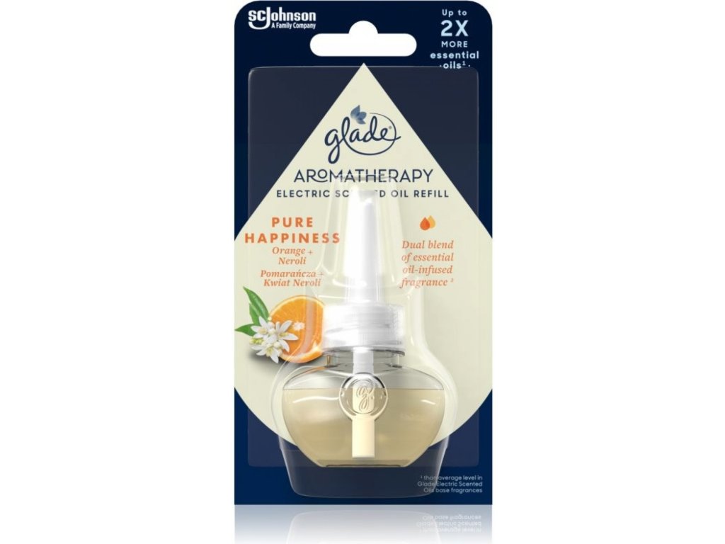 L'aromaterapia utilizza gli oli essenziali per migliorare l'equilibrio e l'armonia del corpo umano, sia fisicamente che psicologicamente. Le fragranze evocano in noi sensazioni piacevoli e, quando ci sentiamo bene, ciò ha un enorme effetto terapeutico sul nostro corpo. Glade® Aromatherapy porta relax, gioia e benessere. È una piacevole terapia che unisce il piacere della fragranza all'effetto stimolante della luce. La combinazione premium di due oli essenziali provenienti da fonti verificate, una formula pura senza parabeni, ftalati, muschio artificiale, coloranti aggiunti e un packaging riciclabile realizzato con materiali già riciclati rendono la linea Glade® Aromatherapy eccezionale. La ricarica Pure Happiness da 20 ml è progettata per il deodorante elettrico per ambienti Glade® Aromatherapy .