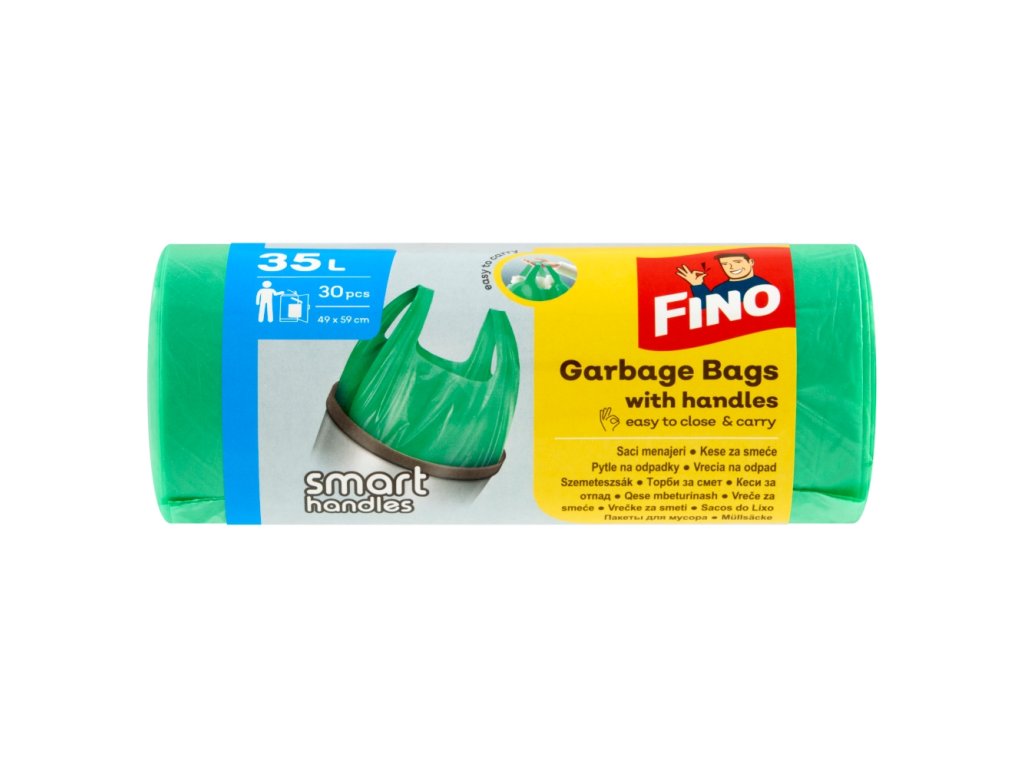 Sacchi per la spazzatura Fino con manici per una facile movimentazione, capacità 35 l, confezione da 20 pezzi, dimensioni di ogni sacco: 49 × 60 cm, HDPE, spessore del sacco 8 micron. Puoi utilizzare i sacchi per i rifiuti non solo in casa, ma anche in aziende, negozi, ecc.