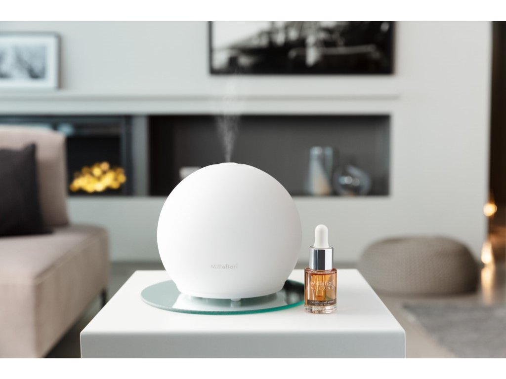 L'elegante diffusore a ultrasuoni è utilizzato con oli essenziali Millefiori Natural. Bastano poche gocce in acqua e, grazie alla rapida evaporazione, il profumo riempirà la stanza in pochi istanti. Allo stesso tempo, l'aria viene umidificata. È completamente sicuro da usare ed è un accessorio interessante e funzionale. Il diffusore a ultrasuoni è completamente silenzioso e si illumina: i colori cambiano o è possibile sceglierne solo uno. Versare la quantità d'acqua specificata nel contenitore secondo le istruzioni e gocciolare l'olio essenziale secondo l'intensità desiderata. Dopo l'evaporazione dell'acqua, il diffusore si spegne automaticamente. Il prodotto non si riscalda.Parametri aggiuntivi