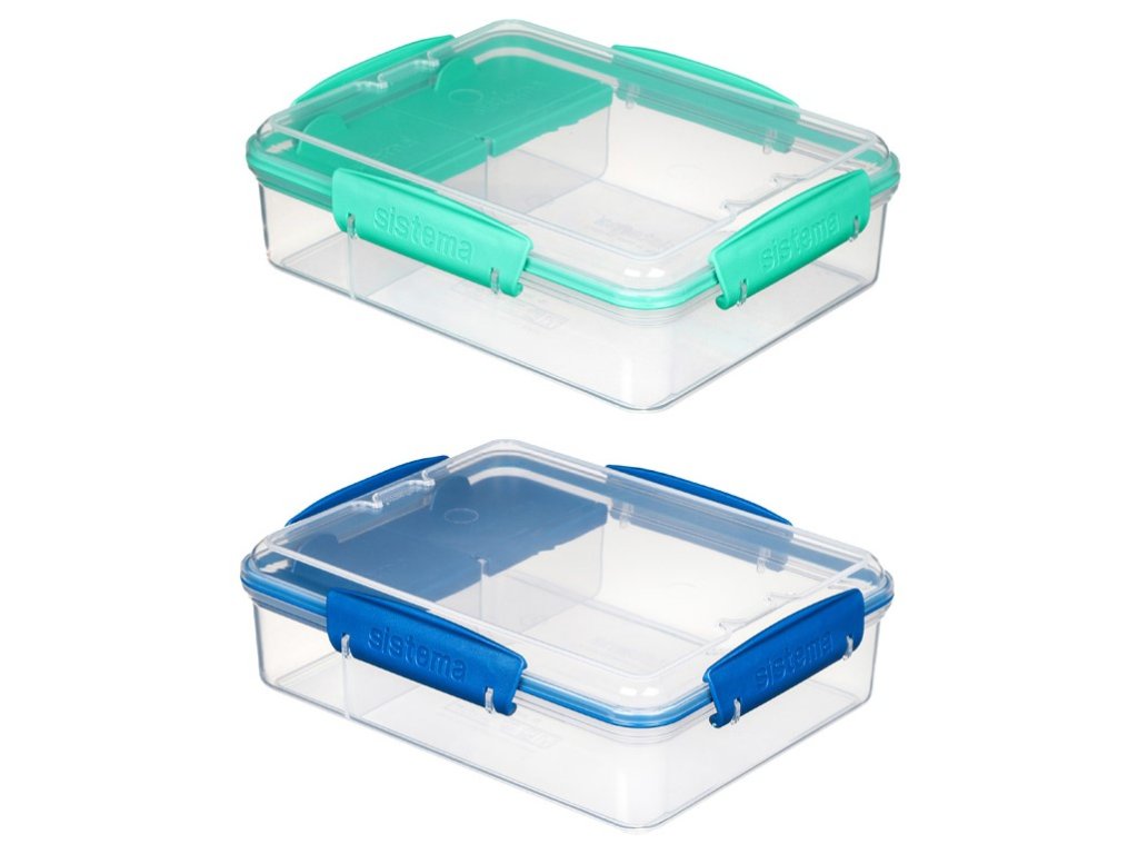 Sistema Lunch Box con 2 Scomparti Separati da 975 ml è una soluzione pratica con tre scomparti separati per preparare gustosi snack e pranzi non solo per i viaggi. Allo stesso tempo, contribuisci a ridurre l'uso di sacchetti di plastica e fogli di alluminio. Il contenitore è realizzato in plastica resistente e ha clip facili da chiudere e una guarnizione flessibile per mantenere la freschezza. Vantaggi: Adatto ai bambini Clip facile da chiudere e coperchio incernierato Due scomparti per tenere separati gli snackParametri aggiuntivi