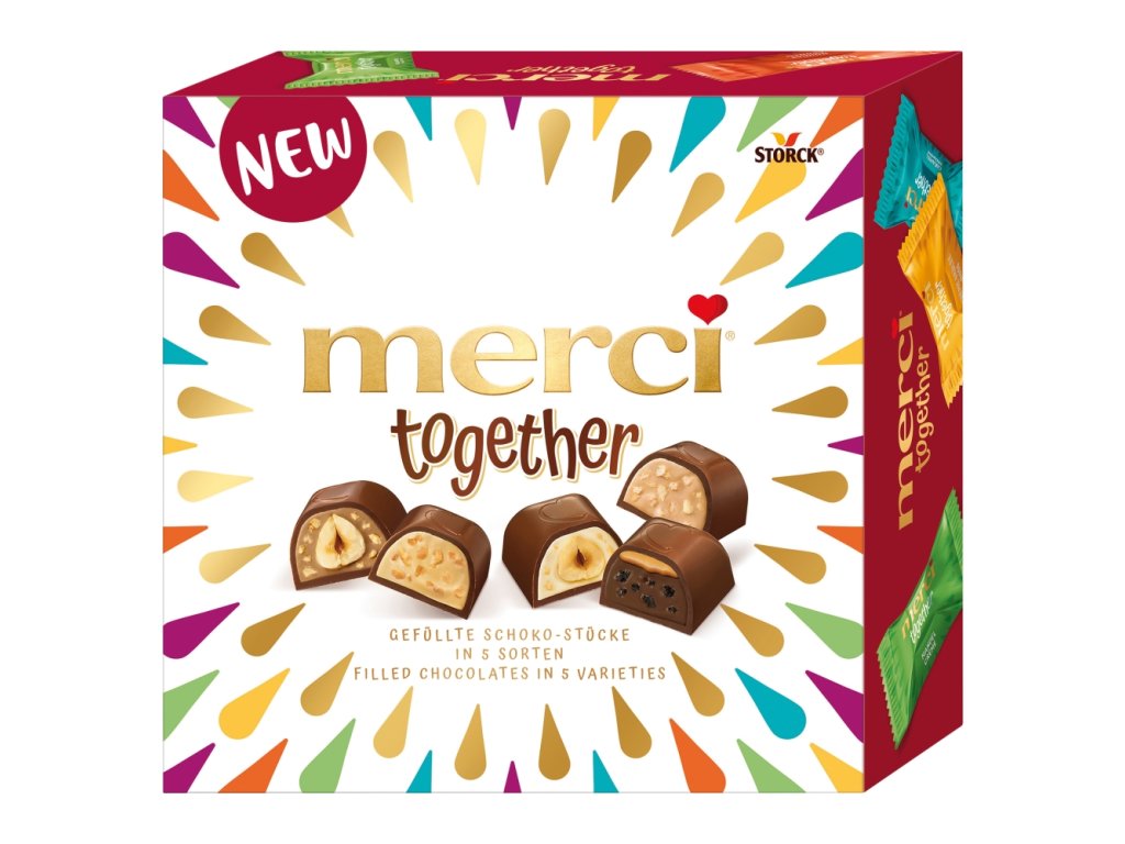 Una collezione di cinque tipi unici di praline di cioccolato, confezionate nella pratica scatola Merci Together: sono più buone se consumate insieme.
